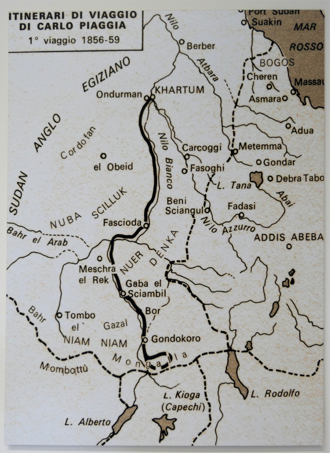 Carlo Piaggia riuscì a rientrare in Patria solamente nel 1877 dopo aver avuto l’onore di tenere un discorso sulle sue esplorazioni e scoperte di fronte ai membri della Società Geografica Khedivale del Cairo.