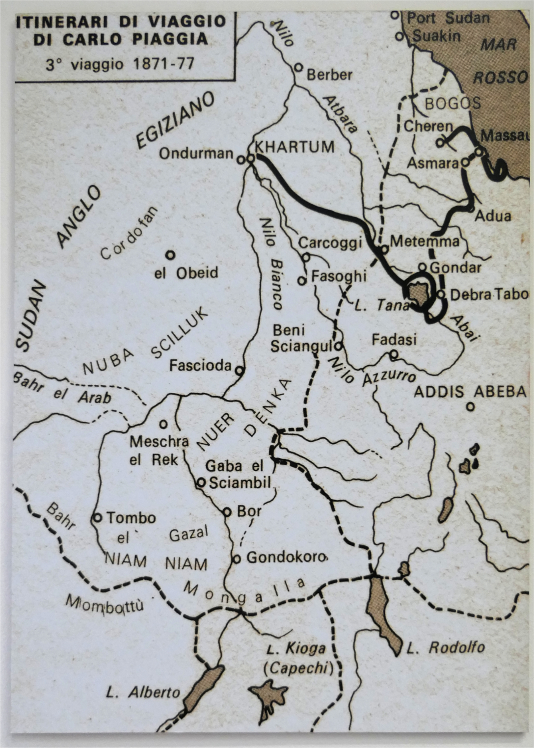 Nel corso del terzo viaggio in Africa (1871 – 1877), Carlo Piaggia, dopo aver trascorso diversi mesi a Massaua e nella regione circostante, decise di intraprendere, nel mese di agosto 1873, una spedizione in Abissinia insieme al console francese di Massaua, de Sarzac, con lo scopo di conoscere Re Joannes.